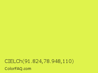CIELCh 91.824,78.948,110 Color is a light yellow color and the nearest color is Starship #ecf245. Hex code #dff34c and RGB value is rgb(223,243,76). In RGB color space, this color is composed of 87% red, 95% green, 30% blue, In CMYK color space, this color is composed of 8% cyan, 0% magenta, 69% yellow , 5% black , In HSL color space, this color has a hue angle of 67° , 87% saturation and 63% lightness.