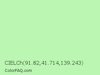 CIELCh 91.82,41.714,139.243 Color is a very light green color and the nearest color is Madang #b7f0be. Hex code #bbf7b2 and RGB value is rgb(187,247,178). In RGB color space, this color is composed of 73% red, 97% green, 70% blue, In CMYK color space, this color is composed of 24% cyan, 0% magenta, 28% yellow , 3% black , In HSL color space, this color has a hue angle of 112° , 81% saturation and 83% lightness.