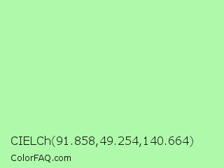 CIELCh 91.858,49.254,140.664 Color is a very light green color and the nearest color is Madang #b7f0be. Hex code #affaaa and RGB value is rgb(175,250,170). In RGB color space, this color is composed of 69% red, 98% green, 67% blue, In CMYK color space, this color is composed of 30% cyan, 0% magenta, 32% yellow , 2% black , In HSL color space, this color has a hue angle of 116° , 89% saturation and 82% lightness.