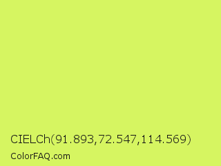 CIELCh 91.893,72.547,114.569 Color is a light lime color and the nearest color is Booger Buster #dde26a. Hex code #d6f561 and RGB value is rgb(214,245,97). In RGB color space, this color is composed of 84% red, 96% green, 38% blue, In CMYK color space, this color is composed of 13% cyan, 0% magenta, 60% yellow , 4% black , In HSL color space, this color has a hue angle of 73° , 88% saturation and 67% lightness.