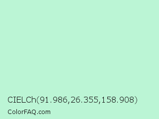 CIELCh 91.986,26.355,158.908 Color is a very light green color and the nearest color is Cruise #b5ecdf. Hex code #bbf5d5 and RGB value is rgb(187,245,213). In RGB color space, this color is composed of 73% red, 96% green, 84% blue, In CMYK color space, this color is composed of 24% cyan, 0% magenta, 13% yellow , 4% black , In HSL color space, this color has a hue angle of 147° , 74% saturation and 85% lightness.