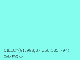 CIELCh 91.998,37.356,185.794 Color is a light cyan color and the nearest color is Electric Blue #7df9ff. Hex code #84fcee and RGB value is rgb(132,252,238). In RGB color space, this color is composed of 52% red, 99% green, 93% blue, In CMYK color space, this color is composed of 48% cyan, 0% magenta, 6% yellow , 1% black , In HSL color space, this color has a hue angle of 173° , 95% saturation and 75% lightness.