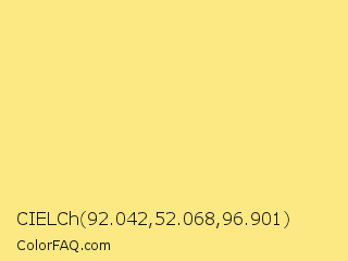 CIELCh 92.042,52.068,96.901 Color is a light yellow color and the nearest color is Yellow Crayola #fce883. Hex code #fde983 and RGB value is rgb(253,233,131). In RGB color space, this color is composed of 99% red, 91% green, 51% blue, In CMYK color space, this color is composed of 0% cyan, 8% magenta, 48% yellow , 1% black , In HSL color space, this color has a hue angle of 50° , 97% saturation and 75% lightness.