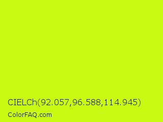 CIELCh 92.057,96.588,114.945 Color is a normal lime color and the nearest color is Arctic Lime #d0ff14. Hex code #c9fa12 and RGB value is rgb(201,250,18). In RGB color space, this color is composed of 79% red, 98% green, 7% blue, In CMYK color space, this color is composed of 20% cyan, 0% magenta, 93% yellow , 2% black , In HSL color space, this color has a hue angle of 73° , 96% saturation and 53% lightness.
