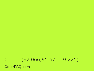 CIELCh 92.066,91.67,119.221 Color is a normal lime color and the nearest color is Green Yellow #adff2f. Hex code #befc38 and RGB value is rgb(190,252,56). In RGB color space, this color is composed of 75% red, 99% green, 22% blue, In CMYK color space, this color is composed of 25% cyan, 0% magenta, 78% yellow , 1% black , In HSL color space, this color has a hue angle of 79° , 97% saturation and 60% lightness.