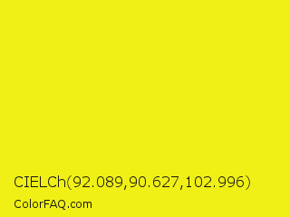 CIELCh 92.089,90.627,102.996 Color is a normal yellow color and the nearest color is Broom #ffec13. Hex code #f0f016 and RGB value is rgb(240,240,22). In RGB color space, this color is composed of 94% red, 94% green, 9% blue, In CMYK color space, this color is composed of 0% cyan, 0% magenta, 91% yellow , 6% black , In HSL color space, this color has a hue angle of 60° , 88% saturation and 51% lightness.