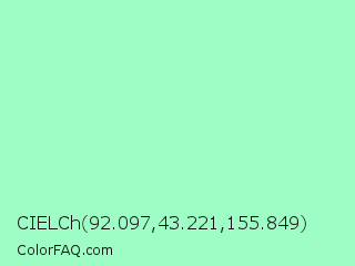 CIELCh 92.097,43.221,155.849 Color is a light green color and the nearest color is Magic Mint #aaf0d1. Hex code #9efcc5 and RGB value is rgb(158,252,197). In RGB color space, this color is composed of 62% red, 99% green, 77% blue, In CMYK color space, this color is composed of 37% cyan, 0% magenta, 22% yellow , 1% black , In HSL color space, this color has a hue angle of 145° , 94% saturation and 80% lightness.