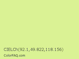 CIELCh 92.1,49.822,118.156 Color is a light lime color and the nearest color is Mindaro #e3f988. Hex code #d9f392 and RGB value is rgb(217,243,146). In RGB color space, this color is composed of 85% red, 95% green, 57% blue, In CMYK color space, this color is composed of 11% cyan, 0% magenta, 40% yellow , 5% black , In HSL color space, this color has a hue angle of 76° , 80% saturation and 76% lightness.