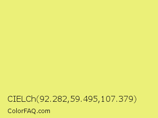 CIELCh 92.282,59.495,107.379 Color is a light yellow color and the nearest color is Manz #eeef78. Hex code #ebf078 and RGB value is rgb(235,240,120). In RGB color space, this color is composed of 92% red, 94% green, 47% blue, In CMYK color space, this color is composed of 2% cyan, 0% magenta, 50% yellow , 6% black , In HSL color space, this color has a hue angle of 63° , 80% saturation and 71% lightness.