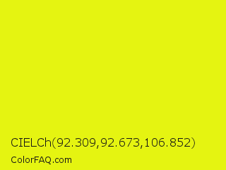 CIELCh 92.309,92.673,106.852 Color is a normal yellow color and the nearest color is Piss Yellow #e1e115. Hex code #e5f411 and RGB value is rgb(229,244,17). In RGB color space, this color is composed of 90% red, 96% green, 7% blue, In CMYK color space, this color is composed of 6% cyan, 0% magenta, 93% yellow , 4% black , In HSL color space, this color has a hue angle of 64° , 91% saturation and 51% lightness.