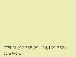 CIELCh 92.365,29.124,109.352 Color is a very light yellow color and the nearest color is Fall Green #ecebbd. Hex code #ebedb4 and RGB value is rgb(235,237,180). In RGB color space, this color is composed of 92% red, 93% green, 71% blue, In CMYK color space, this color is composed of 1% cyan, 0% magenta, 24% yellow , 7% black , In HSL color space, this color has a hue angle of 62° , 61% saturation and 82% lightness.