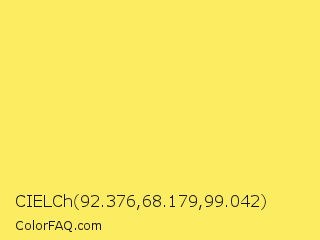CIELCh 92.376,68.179,99.042 Color is a light yellow color and the nearest color is Candy Corn #fbec5d. Hex code #fcec61 and RGB value is rgb(252,236,97). In RGB color space, this color is composed of 99% red, 93% green, 38% blue, In CMYK color space, this color is composed of 0% cyan, 6% magenta, 62% yellow , 1% black , In HSL color space, this color has a hue angle of 54° , 96% saturation and 68% lightness.