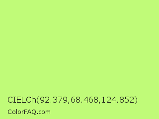 CIELCh 92.379,68.468,124.852 Color is a light green color and the nearest color is Sulu #c1f07c. Hex code #c0fb78 and RGB value is rgb(192,251,120). In RGB color space, this color is composed of 75% red, 98% green, 47% blue, In CMYK color space, this color is composed of 24% cyan, 0% magenta, 52% yellow , 2% black , In HSL color space, this color has a hue angle of 87° , 94% saturation and 73% lightness.