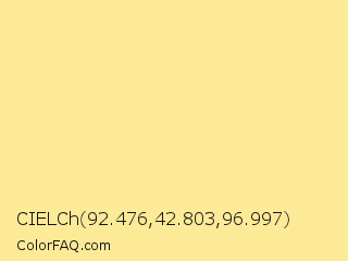 CIELCh 92.476,42.803,96.997 Color is a light yellow color and the nearest color is Golden Glow #fde295. Hex code #fcea97 and RGB value is rgb(252,234,151). In RGB color space, this color is composed of 99% red, 92% green, 59% blue, In CMYK color space, this color is composed of 0% cyan, 7% magenta, 40% yellow , 1% black , In HSL color space, this color has a hue angle of 49° , 94% saturation and 79% lightness.