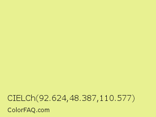 CIELCh 92.624,48.387,110.577 Color is a light yellow color and the nearest color is Key Lime #e8f48c. Hex code #e8f191 and RGB value is rgb(232,241,145). In RGB color space, this color is composed of 91% red, 95% green, 57% blue, In CMYK color space, this color is composed of 4% cyan, 0% magenta, 40% yellow , 5% black , In HSL color space, this color has a hue angle of 66° , 77% saturation and 76% lightness.