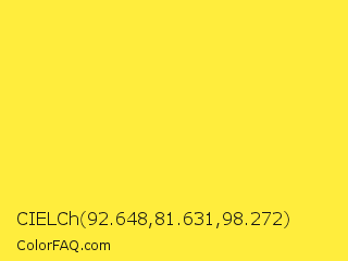 CIELCh 92.648,81.631,98.272 Color is a light yellow color and the nearest color is Banana Yellow #ffe135. Hex code #ffed3d and RGB value is rgb(255,237,61). In RGB color space, this color is composed of 100% red, 93% green, 24% blue, In CMYK color space, this color is composed of 0% cyan, 7% magenta, 76% yellow , 0% black , In HSL color space, this color has a hue angle of 54° , 100% saturation and 62% lightness.