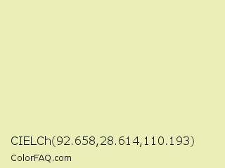 CIELCh 92.658,28.614,110.193 Color is a very light yellow color and the nearest color is Fall Green #ecebbd. Hex code #ebeeb6 and RGB value is rgb(235,238,182). In RGB color space, this color is composed of 92% red, 93% green, 71% blue, In CMYK color space, this color is composed of 1% cyan, 0% magenta, 24% yellow , 7% black , In HSL color space, this color has a hue angle of 63° , 62% saturation and 82% lightness.