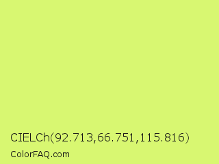 CIELCh 92.713,66.751,115.816 Color is a light lime color and the nearest color is Booger Buster #dde26a. Hex code #d8f771 and RGB value is rgb(216,247,113). In RGB color space, this color is composed of 85% red, 97% green, 44% blue, In CMYK color space, this color is composed of 13% cyan, 0% magenta, 54% yellow , 3% black , In HSL color space, this color has a hue angle of 74° , 89% saturation and 71% lightness.