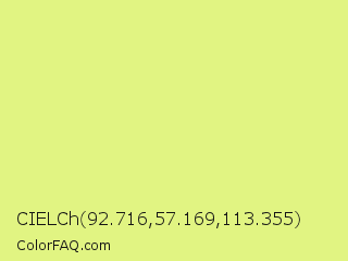 CIELCh 92.716,57.169,113.355 Color is a light yellow color and the nearest color is Mindaro #e3f988. Hex code #e1f482 and RGB value is rgb(225,244,130). In RGB color space, this color is composed of 88% red, 96% green, 51% blue, In CMYK color space, this color is composed of 8% cyan, 0% magenta, 47% yellow , 4% black , In HSL color space, this color has a hue angle of 70° , 84% saturation and 73% lightness.