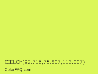 CIELCh 92.716,75.807,113.007 Color is a light lime color and the nearest color is Maximum Green Yellow #d9e650. Hex code #dbf75a and RGB value is rgb(219,247,90). In RGB color space, this color is composed of 86% red, 97% green, 35% blue, In CMYK color space, this color is composed of 11% cyan, 0% magenta, 64% yellow , 3% black , In HSL color space, this color has a hue angle of 71° , 91% saturation and 66% lightness.