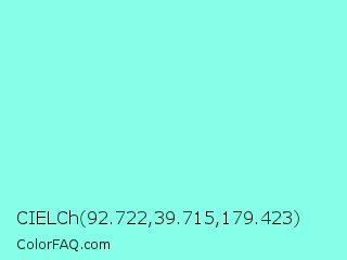 CIELCh 92.722,39.715,179.423 Color is a light cyan color and the nearest color is Aquamarine #7fffd4. Hex code #85ffe8 and RGB value is rgb(133,255,232). In RGB color space, this color is composed of 52% red, 100% green, 91% blue, In CMYK color space, this color is composed of 48% cyan, 0% magenta, 9% yellow , 0% black , In HSL color space, this color has a hue angle of 169° , 100% saturation and 76% lightness.
