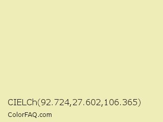 CIELCh 92.724,27.602,106.365 Color is a very light yellow color and the nearest color is Fall Green #ecebbd. Hex code #efedb7 and RGB value is rgb(239,237,183). In RGB color space, this color is composed of 94% red, 93% green, 72% blue, In CMYK color space, this color is composed of 0% cyan, 1% magenta, 23% yellow , 6% black , In HSL color space, this color has a hue angle of 58° , 64% saturation and 83% lightness.