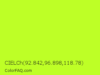 CIELCh 92.842,96.898,118.78 Color is a normal lime color and the nearest color is Green Yellow #adff2f. Hex code #beff26 and RGB value is rgb(190,255,38). In RGB color space, this color is composed of 75% red, 100% green, 15% blue, In CMYK color space, this color is composed of 25% cyan, 0% magenta, 85% yellow , 0% black , In HSL color space, this color has a hue angle of 78° , 100% saturation and 57% lightness.