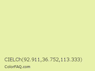 CIELCh 92.911,36.752,113.333 Color is a light yellow color and the nearest color is Pale Goldenrod #eee8aa. Hex code #e7f1a9 and RGB value is rgb(231,241,169). In RGB color space, this color is composed of 91% red, 95% green, 66% blue, In CMYK color space, this color is composed of 4% cyan, 0% magenta, 30% yellow , 5% black , In HSL color space, this color has a hue angle of 68° , 72% saturation and 80% lightness.