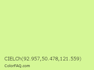 CIELCh 92.957,50.478,121.559 Color is a light green color and the nearest color is Reef #c9ffa2. Hex code #d5f796 and RGB value is rgb(213,247,150). In RGB color space, this color is composed of 84% red, 97% green, 59% blue, In CMYK color space, this color is composed of 14% cyan, 0% magenta, 39% yellow , 3% black , In HSL color space, this color has a hue angle of 81° , 86% saturation and 78% lightness.