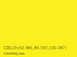 CIELCh 92.981,89.597,100.087 Color is a normal yellow color and the nearest color is Broom #ffec13. Hex code #fbf01e and RGB value is rgb(251,240,30). In RGB color space, this color is composed of 98% red, 94% green, 12% blue, In CMYK color space, this color is composed of 0% cyan, 4% magenta, 88% yellow , 2% black , In HSL color space, this color has a hue angle of 57° , 97% saturation and 55% lightness.