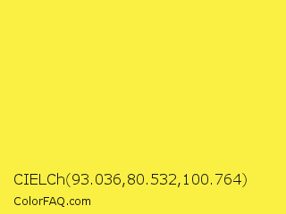 CIELCh 93.036,80.532,100.764 Color is a light yellow color and the nearest color is Gorse #fff14f. Hex code #faf043 and RGB value is rgb(250,240,67). In RGB color space, this color is composed of 98% red, 94% green, 26% blue, In CMYK color space, this color is composed of 0% cyan, 4% magenta, 73% yellow , 2% black , In HSL color space, this color has a hue angle of 57° , 95% saturation and 62% lightness.