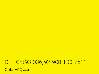 CIELCh 93.036,92.908,100.751 Color is a normal yellow color and the nearest color is Aureolin #fdee00. Hex code #f9f100 and RGB value is rgb(249,241,0). In RGB color space, this color is composed of 98% red, 95% green, 0% blue, In CMYK color space, this color is composed of 0% cyan, 3% magenta, 100% yellow , 2% black , In HSL color space, this color has a hue angle of 58° , 100% saturation and 49% lightness.