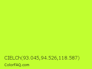 CIELCh 93.045,94.526,118.587 Color is a normal lime color and the nearest color is Green Yellow #adff2f. Hex code #c1ff30 and RGB value is rgb(193,255,48). In RGB color space, this color is composed of 76% red, 100% green, 19% blue, In CMYK color space, this color is composed of 24% cyan, 0% magenta, 81% yellow , 0% black , In HSL color space, this color has a hue angle of 78° , 100% saturation and 59% lightness.