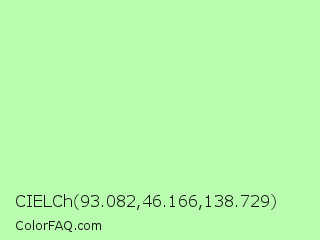 CIELCh 93.082,46.166,138.729 Color is a very light green color and the nearest color is Madang #b7f0be. Hex code #bafcaf and RGB value is rgb(186,252,175). In RGB color space, this color is composed of 73% red, 99% green, 69% blue, In CMYK color space, this color is composed of 26% cyan, 0% magenta, 31% yellow , 1% black , In HSL color space, this color has a hue angle of 111° , 93% saturation and 84% lightness.