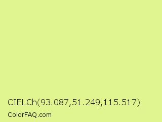 CIELCh 93.087,51.249,115.517 Color is a light lime color and the nearest color is Key Lime #e8f48c. Hex code #e0f590 and RGB value is rgb(224,245,144). In RGB color space, this color is composed of 88% red, 96% green, 56% blue, In CMYK color space, this color is composed of 9% cyan, 0% magenta, 41% yellow , 4% black , In HSL color space, this color has a hue angle of 72° , 83% saturation and 76% lightness.
