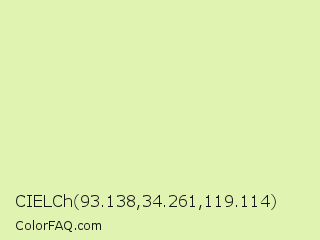 CIELCh 93.138,34.261,119.114 Color is a very light lime color and the nearest color is Caper #dcedb4. Hex code #e1f3b1 and RGB value is rgb(225,243,177). In RGB color space, this color is composed of 88% red, 95% green, 69% blue, In CMYK color space, this color is composed of 7% cyan, 0% magenta, 27% yellow , 5% black , In HSL color space, this color has a hue angle of 76° , 73% saturation and 82% lightness.