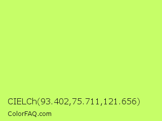 CIELCh 93.402,75.711,121.656 Color is a light green color and the nearest color is Sulu #c1f07c. Hex code #c6fe68 and RGB value is rgb(198,254,104). In RGB color space, this color is composed of 78% red, 100% green, 41% blue, In CMYK color space, this color is composed of 22% cyan, 0% magenta, 59% yellow , 0% black , In HSL color space, this color has a hue angle of 82° , 99% saturation and 70% lightness.