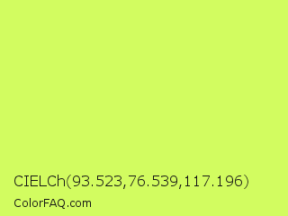 CIELCh 93.523,76.539,117.196 Color is a light lime color and the nearest color is Maximum Green Yellow #d9e650. Hex code #d2fc60 and RGB value is rgb(210,252,96). In RGB color space, this color is composed of 82% red, 99% green, 38% blue, In CMYK color space, this color is composed of 17% cyan, 0% magenta, 62% yellow , 1% black , In HSL color space, this color has a hue angle of 76° , 96% saturation and 68% lightness.