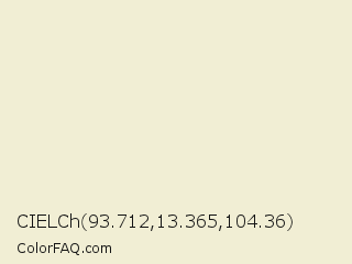 CIELCh 93.712,13.365,104.36 Color is a very light yellow color and the nearest color is Janna #f4ebd3. Hex code #f1eed4 and RGB value is rgb(241,238,212). In RGB color space, this color is composed of 95% red, 93% green, 83% blue, In CMYK color space, this color is composed of 0% cyan, 1% magenta, 12% yellow , 5% black , In HSL color space, this color has a hue angle of 54° , 51% saturation and 89% lightness.