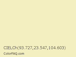 CIELCh 93.727,23.547,104.603 Color is a very light yellow color and the nearest color is Mint Julep #f1eec1. Hex code #f3efc1 and RGB value is rgb(243,239,193). In RGB color space, this color is composed of 95% red, 94% green, 76% blue, In CMYK color space, this color is composed of 0% cyan, 2% magenta, 21% yellow , 5% black , In HSL color space, this color has a hue angle of 55° , 68% saturation and 85% lightness.