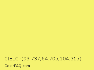 CIELCh 93.737,64.705,104.315 Color is a light yellow color and the nearest color is Paris Daisy #fff46e. Hex code #f5f36f and RGB value is rgb(245,243,111). In RGB color space, this color is composed of 96% red, 95% green, 44% blue, In CMYK color space, this color is composed of 0% cyan, 1% magenta, 55% yellow , 4% black , In HSL color space, this color has a hue angle of 59° , 87% saturation and 70% lightness.