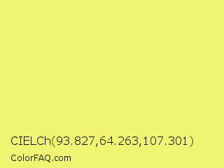 CIELCh 93.827,64.263,107.301 Color is a light yellow color and the nearest color is Manz #eeef78. Hex code #eff572 and RGB value is rgb(239,245,114). In RGB color space, this color is composed of 94% red, 96% green, 45% blue, In CMYK color space, this color is composed of 2% cyan, 0% magenta, 53% yellow , 4% black , In HSL color space, this color has a hue angle of 63° , 87% saturation and 70% lightness.