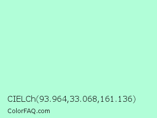 CIELCh 93.964,33.068,161.136 Color is a very light green color and the nearest color is Magic Mint #aaf0d1. Hex code #b1fed8 and RGB value is rgb(177,254,216). In RGB color space, this color is composed of 69% red, 100% green, 85% blue, In CMYK color space, this color is composed of 30% cyan, 0% magenta, 15% yellow , 0% black , In HSL color space, this color has a hue angle of 150° , 97% saturation and 85% lightness.
