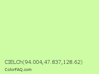 CIELCh 94.004,47.837,128.62 Color is a very light green color and the nearest color is Reef #c9ffa2. Hex code #cdfca4 and RGB value is rgb(205,252,164). In RGB color space, this color is composed of 80% red, 99% green, 64% blue, In CMYK color space, this color is composed of 19% cyan, 0% magenta, 35% yellow , 1% black , In HSL color space, this color has a hue angle of 92° , 94% saturation and 82% lightness.