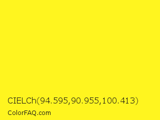 CIELCh 94.595,90.955,100.413 Color is a normal yellow color and the nearest color is Broom #ffec13. Hex code #fff51f and RGB value is rgb(255,245,31). In RGB color space, this color is composed of 100% red, 96% green, 12% blue, In CMYK color space, this color is composed of 0% cyan, 4% magenta, 88% yellow , 0% black , In HSL color space, this color has a hue angle of 57° , 100% saturation and 56% lightness.