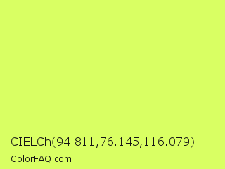 CIELCh 94.811,76.145,116.079 Color is a light lime color and the nearest color is Canary #f3fb62. Hex code #d9ff63 and RGB value is rgb(217,255,99). In RGB color space, this color is composed of 85% red, 100% green, 39% blue, In CMYK color space, this color is composed of 15% cyan, 0% magenta, 61% yellow , 0% black , In HSL color space, this color has a hue angle of 75° , 100% saturation and 69% lightness.