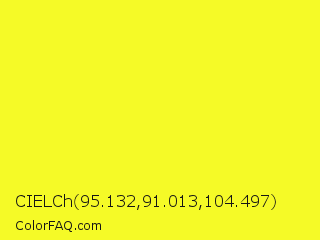 CIELCh 95.132,91.013,104.497 Color is a normal yellow color and the nearest color is Daffodil #ffff31. Hex code #f5fa27 and RGB value is rgb(245,250,39). In RGB color space, this color is composed of 96% red, 98% green, 15% blue, In CMYK color space, this color is composed of 2% cyan, 0% magenta, 84% yellow , 2% black , In HSL color space, this color has a hue angle of 61° , 95% saturation and 57% lightness.