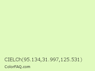 CIELCh 95.134,31.997,125.531 Color is a very light green color and the nearest color is Tusk #eef3c3. Hex code #e0fabe and RGB value is rgb(224,250,190). In RGB color space, this color is composed of 88% red, 98% green, 75% blue, In CMYK color space, this color is composed of 10% cyan, 0% magenta, 24% yellow , 2% black , In HSL color space, this color has a hue angle of 86° , 86% saturation and 86% lightness.