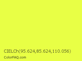 CIELCh 95.624,85.624,110.056 Color is a light yellow color and the nearest color is Starship #ecf245. Hex code #e8ff45 and RGB value is rgb(232,255,69). In RGB color space, this color is composed of 91% red, 100% green, 27% blue, In CMYK color space, this color is composed of 9% cyan, 0% magenta, 73% yellow , 0% black , In HSL color space, this color has a hue angle of 67° , 100% saturation and 64% lightness.