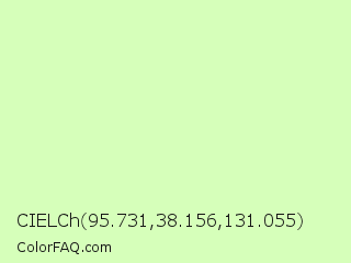 CIELCh 95.731,38.156,131.055 Color is a very light green color and the nearest color is Gossip #d2f8b0. Hex code #d6ffba and RGB value is rgb(214,255,186). In RGB color space, this color is composed of 84% red, 100% green, 73% blue, In CMYK color space, this color is composed of 16% cyan, 0% magenta, 27% yellow , 0% black , In HSL color space, this color has a hue angle of 96° , 100% saturation and 86% lightness.